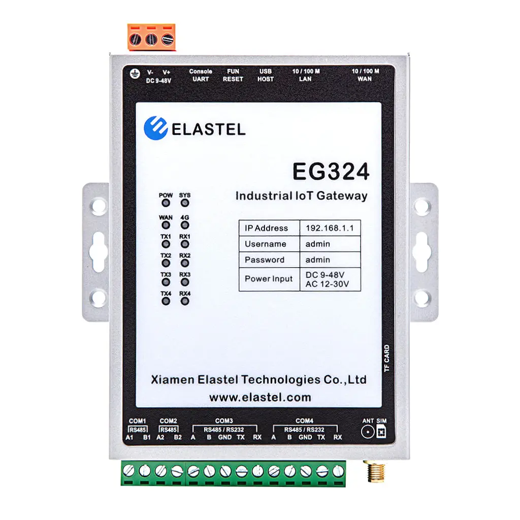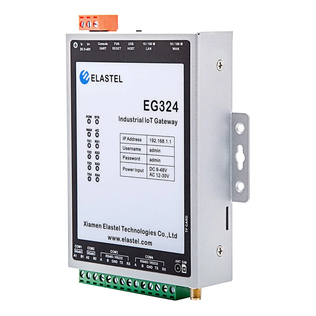 La Elastel EG324 est une passerelle IoT basée sur l'architecture ARM qui fournit une plateforme de calcul haute performance pour les applications d'acquisition de données et de communication embarquées. Elle est dotée de 4 ports série RS485/232 et de deux ports Ethernet 10/100 Mbps, ainsi que d'une prise Mini PCIe pour prendre en charge les modules cellulaires 4G LTE/3G/2G/NB-IoT/Cat M1. Ces capacités polyvalentes permettent aux utilisateurs d'adapter efficacement l'EG324 à une variété de solutions de communication complexes.