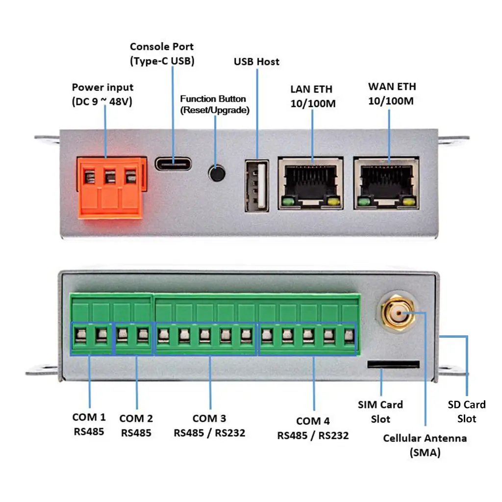 Supporte 4G LTE/3G/2G/NB-IoT/Cat M1 via mPCIe, double Ethernet 10/100 Mbps autodétectant et USB pour module WiFi.