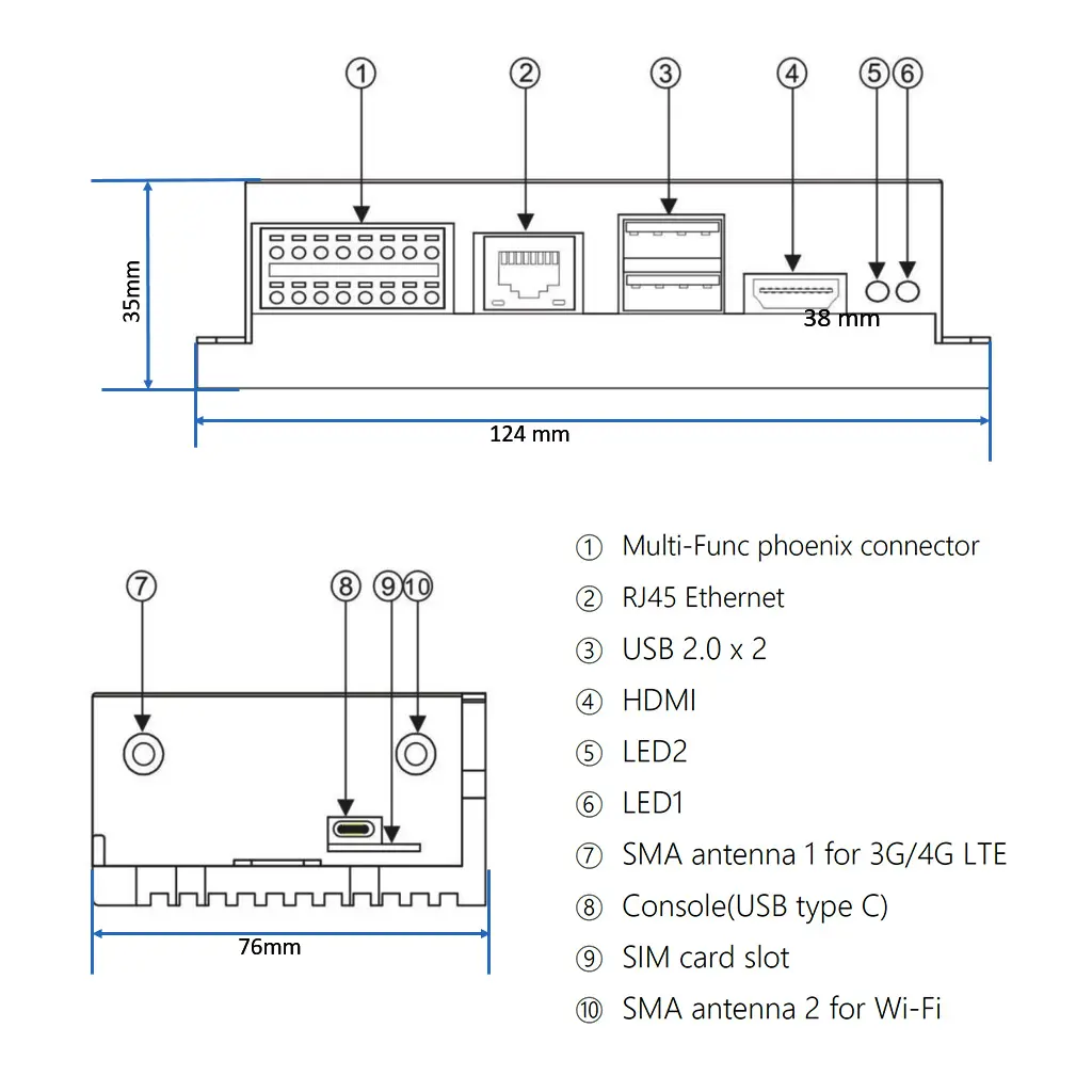 | Fonctionnalités application | Acquisition de données, Modbus RTU, VPN, Routeur, Pare-feu, Lecteur multimédia… Python, Node-RED, Docker… Développement secondaire via SDK |